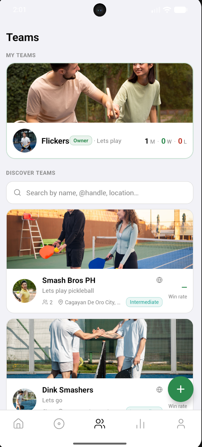 Find games instantly, post your availability, and connect with nearby players. Browse the live game feed or get matched automatically by skill level.